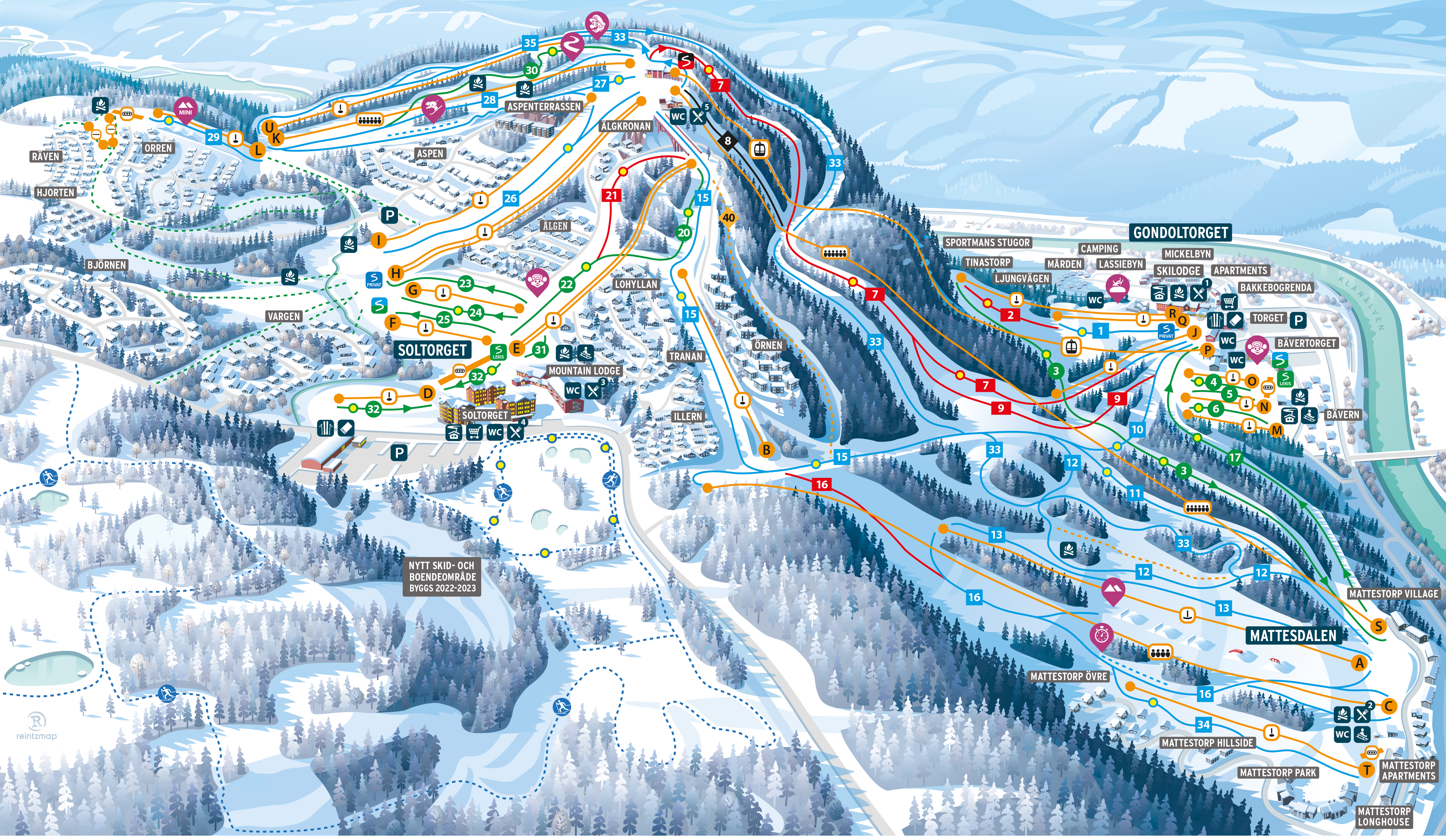 Udover pisterne kan I også finde alle andre faciliteter på pistekortet, som hjælper jer med at planlægge dagen. Branäs pistekort viser placeringen af restauranter, varmestuer, skileje og mødesteder for skiskolen. Det er også her, I finder de mange populære grillpladser, hvor I kan nyde jeres medbragte mad i sneen.