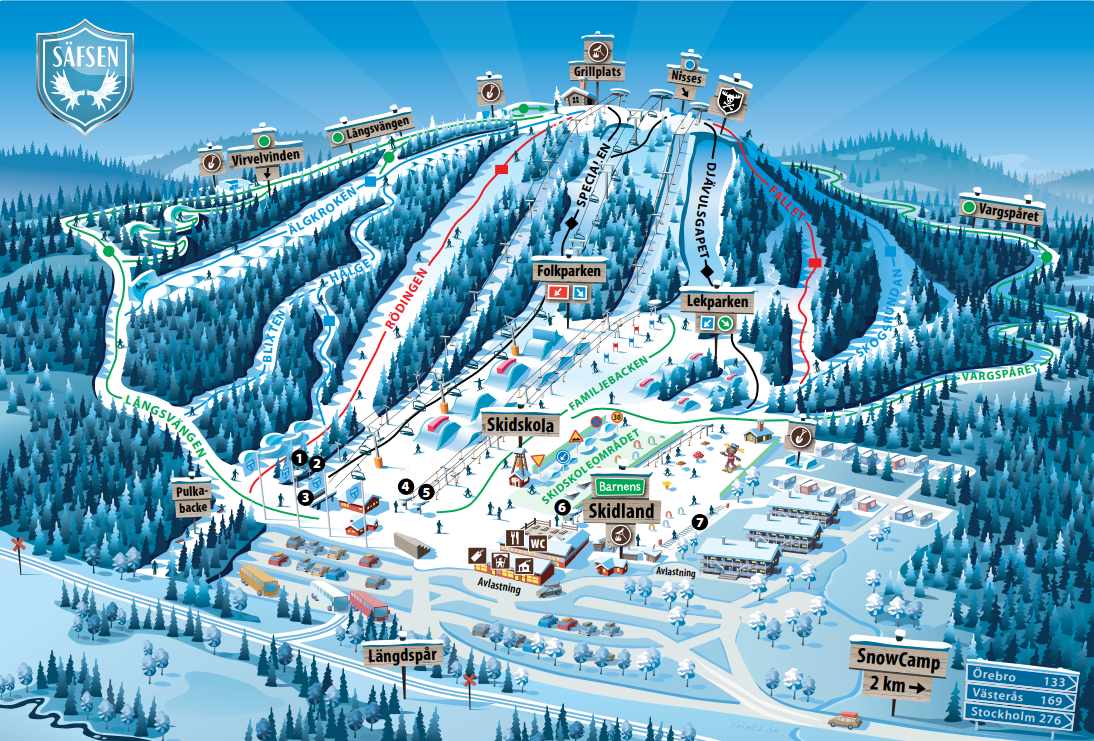 Udover pisterne kan I finde alle de vigtige faciliteter markeret henad pistekortet, hvilket gør hverdagen nem for hele familien. Säfsen pistekort viser placeringen af restauranter, varmestuer og skileje. Det hjælper jer ligeledes med at finde frem til de gode grillpladser, hvor I kan holde et pusterum og nyde jeres frokost udendørs.
