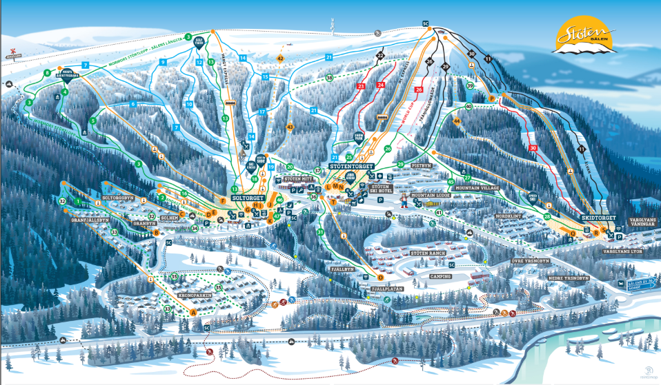 Udover pisterne kan I også se alle andre faciliteter på pistekortet, som hjælper jer med at få en bekymringsfri dag på ski. Stöten pistekort viser placeringen af Stötens torv, restauranter, varmestuer og skileje. Stöten er kendt for sit kompakte setup, hvor næsten alt overnatning har ski-in/ski-out, hvilket gør logistikken utrolig nem for familier.
