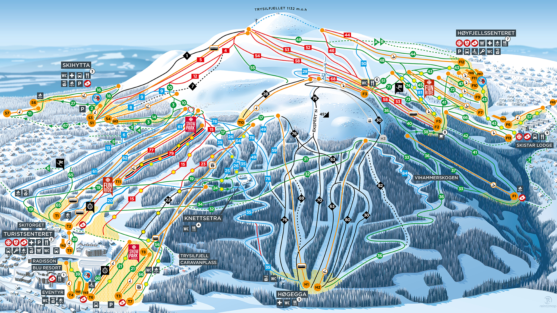 Trysil pistekort dækker hele fjeldsiderne, som er inddelt i fire sammenhængende områder: Turistscentret, Høyfjellssenteret, Skihytta og Høgegga. Det betyder, at du kan stå på ski hele dagen, og samtidig opdage og udforske nye ruter. Elsker du mere udfordrende terræn, er Høgegga stedet for dig, mens de øvrige områder passer bedre til nybegyndere og familier. På Trysil pistekort kan du nemt se, hvilke pister der passer bedst til dit niveau, uanset om du er nybegynder, lettere øvede eller erfaren skiløber.